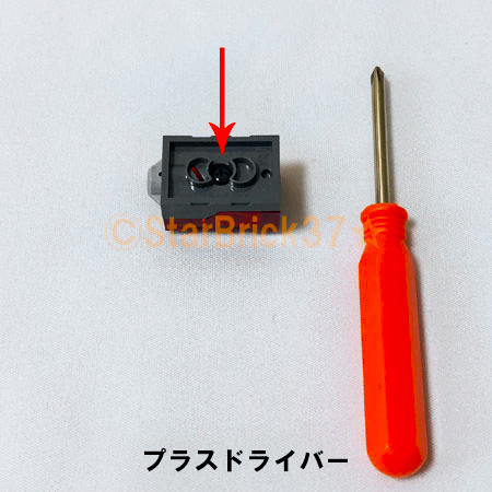 ライトブロックの裏側にある下↓部分のビスをプラスドライバーではずします。